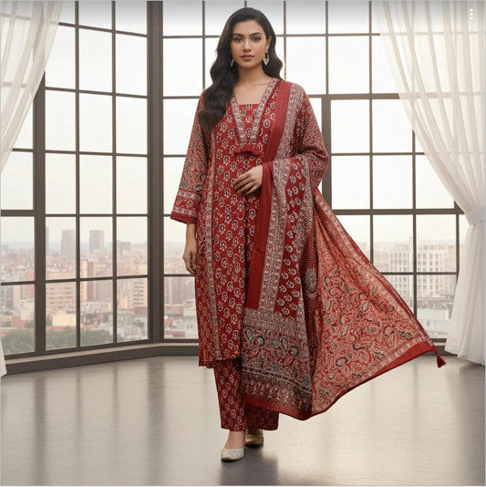 Premium Cotton Suit in Wine Solid Base