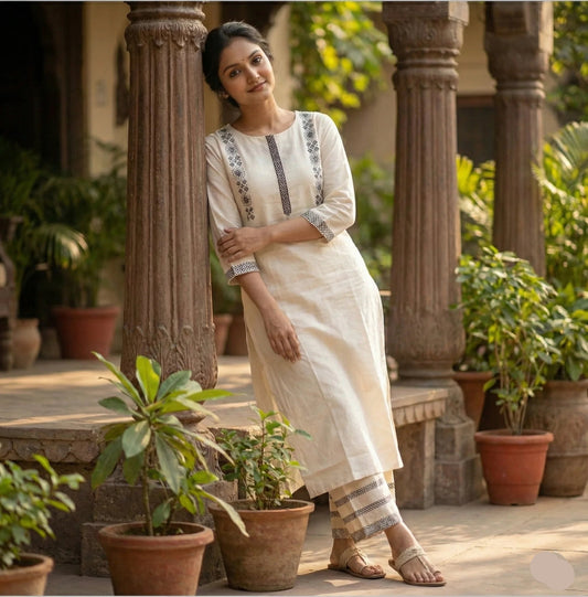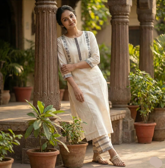 Elegant Off White Straight fit Embroidered Cotton Kurta with Palazzo