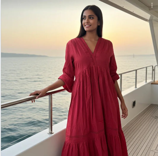 Beautiful Embroidered Cotton Midi Dress in Rust Colour