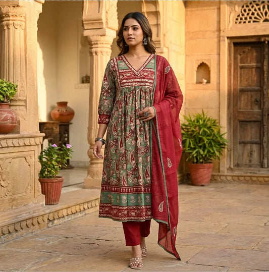 Elegant Cotton A line Embroidery Co-ord Set in Olive Green