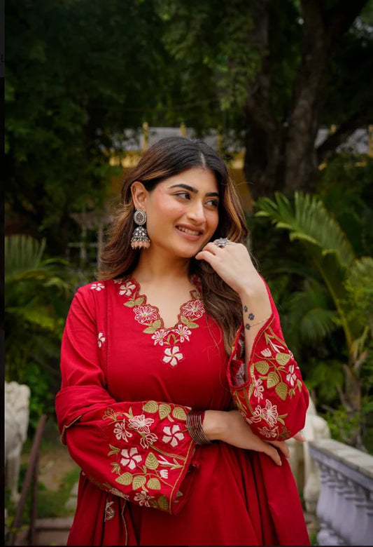 Premium Embroidered Mul Cotton Flared Suit Set in Red