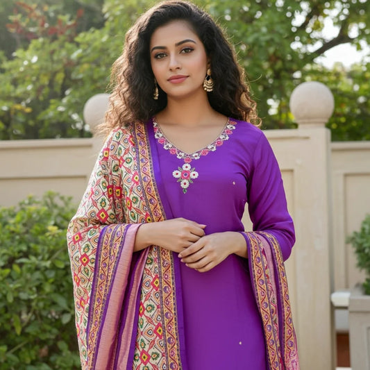 Stunning Purple Russian Silk Straight Suit along with Gajji Silk Dupatta