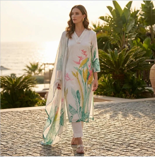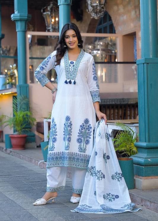 Elegant Floral Printed Cotton A-line Suit Set In White