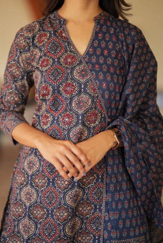 Premium Cotton Ajrakh Kurti Set With Hand Work Highlights.