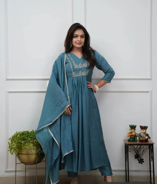 Beautiful Muslin Silk Anarkali Dupatta Suit In Teal Colour