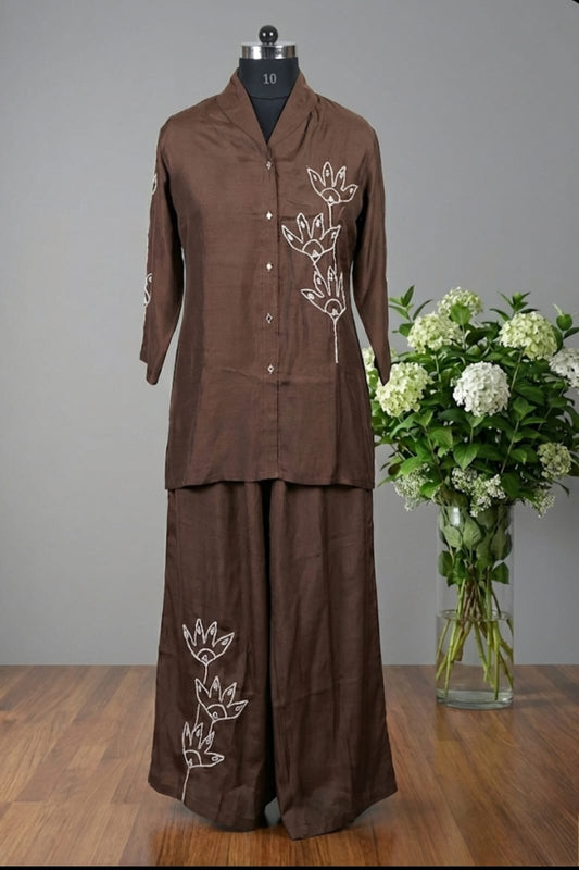 Solid Floral Cord Work Straight Fit Co-ord Set in Brown