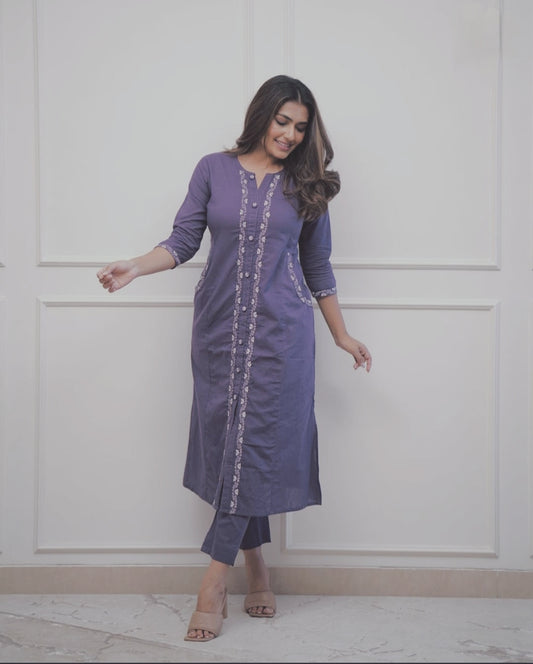 Beautiful Lavender Embroidered Cotton A Line Kurti Pant Set
