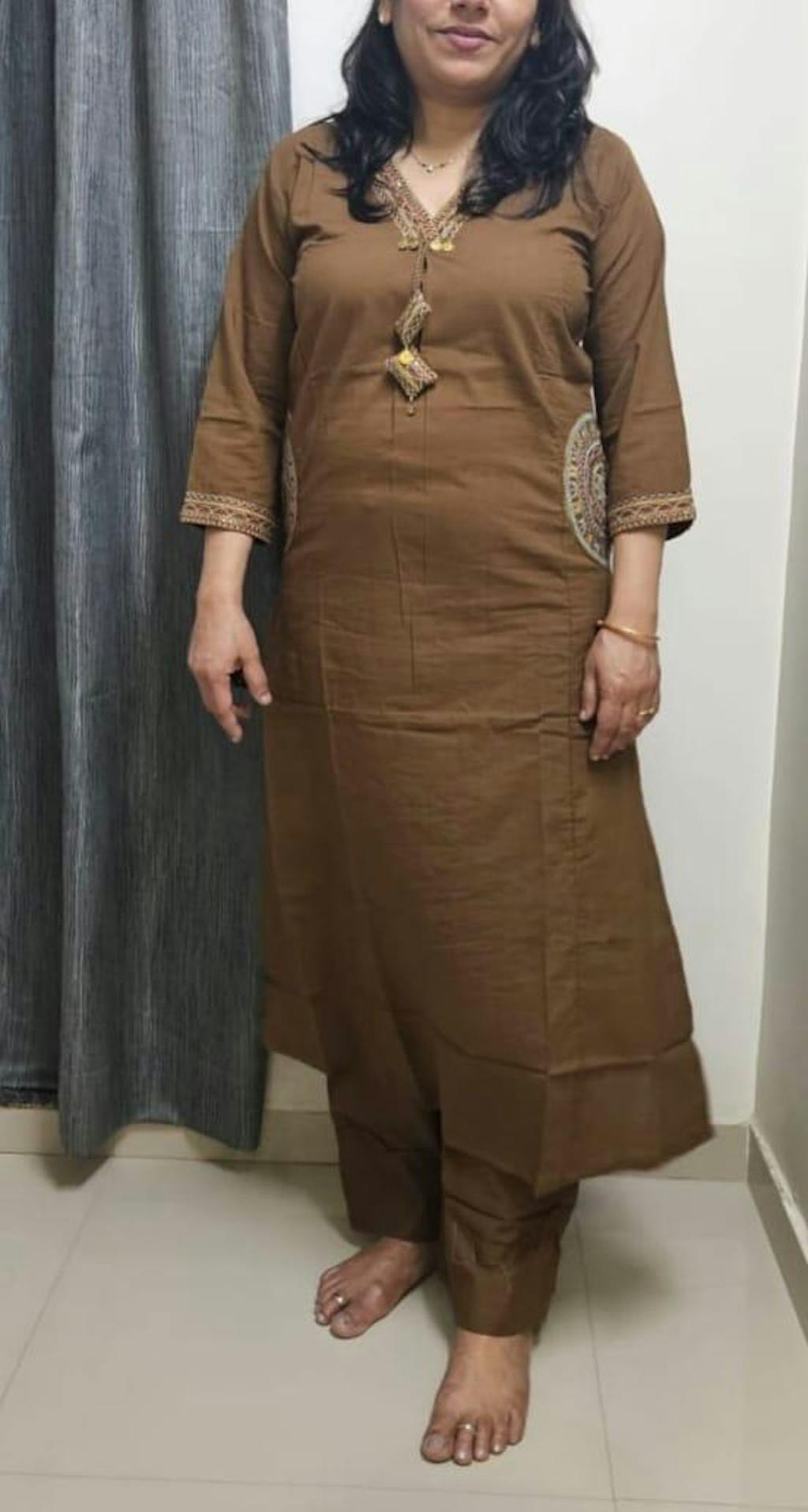 This Gamthi Style Kurti Set showcases a brown cotton kurta adorned with exquisite hand embroidery and fine embellishments. Featuring long sleeves and a refined V-neckline with an elegant panel, it also includes functional pockets on both sides. The neckline, pockets, and cuffs are beautifully accented with intricate hand-thread embroidery and highlighted by delicate gold-toned coins hanging from the neckline. Made from soft, cotton fabric, this set offers a perfect blend of comfort and sophisticated craftsmanship.
