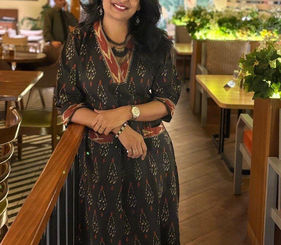 This black Ikat print Kurti set features red and white accents and includes a Kurti and palazzo pants. The Kurti has a V-neck with a red and white patterned trim, three-quarter sleeves with similar trim, and two small pockets near the bust. The palazzo pants are red with white Ikkat patterns at the bottom. This comfortable cotton fabric is suitable for casual or semi-formal occasions.
