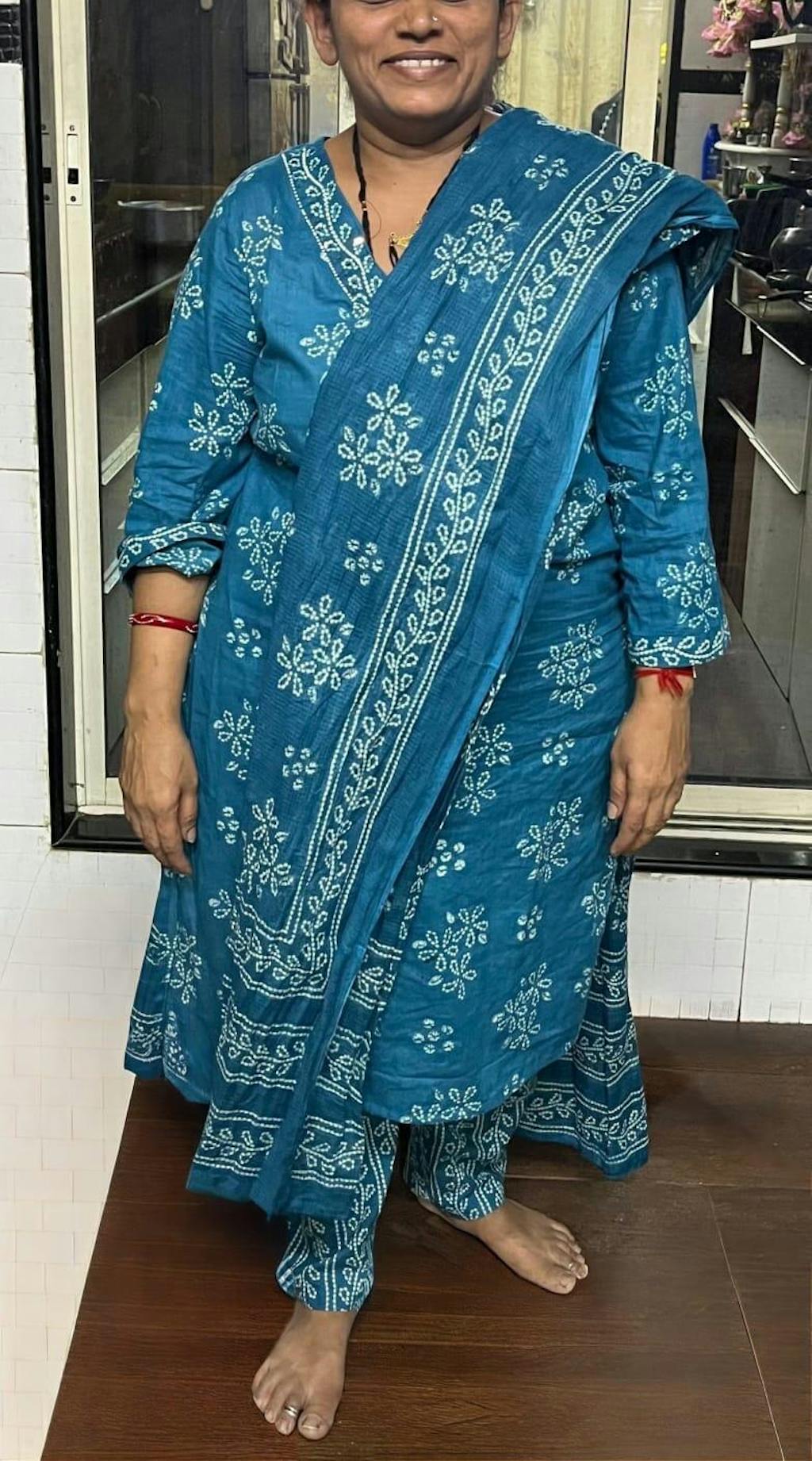 Upgrade your summer wardrobe with this Bandhej Print Premium Cotton Suit Set In Stunning Aqua Blue. The Kurti features a V-neck and delicate bead embroidery, the bandhej floral print suit comes with a kota doria dupatta and printed pants. A must-have for comfortable and fashionable wear this season.